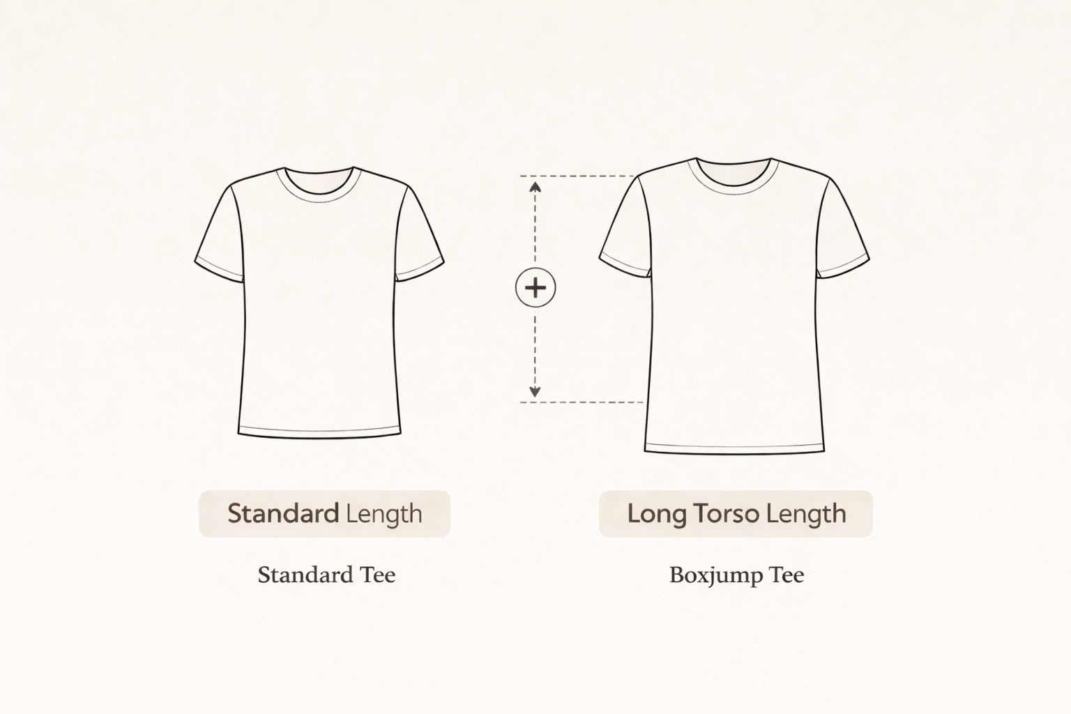 If your torso is longer, “standard” tees ride up, look cropped, or force you to size up—then everything gets boxy.